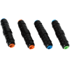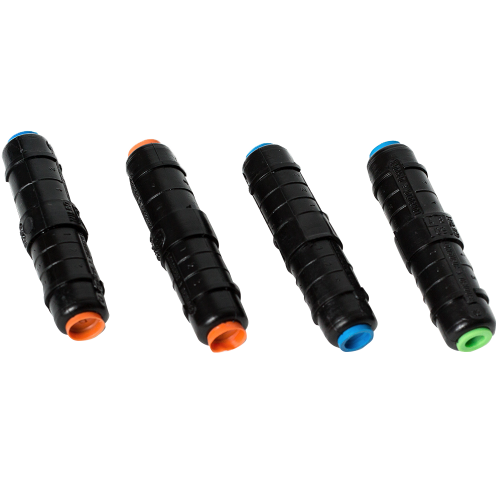 Во избежание ошибочного применения защитные заглушки приспособлений маркируются разными цветами. Само соединение выполняется способом опрессовки. Пластиковый корпус стоек к воздействию УФ-лучей, температурным перепадам, влаге.