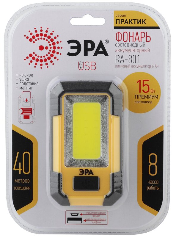 ЭРА RA-801 мощный фонарь-powerbank с литиевым аккумулятором. Яркий свет + возможность оперативно подзарядить любое мобильное устройство. Два функциональных гаджета в одном! Незаменимая вещь в путешествии, за городом, на строительных и ремонтных работах. Мощный литиевый аккумулятор 6 мАч - гарантия бесперебойной работы устройства в течение 8 полных часов. USB-шнур в комплекте.