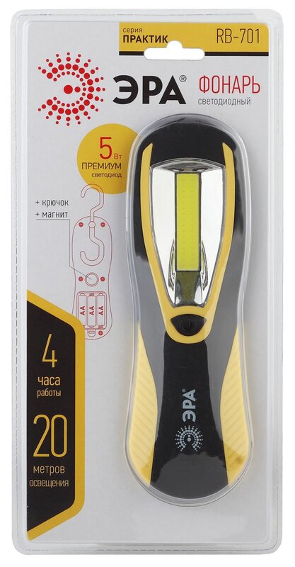 Корпус изготовлен из ударопрочного пластика. Серию ЭРА Практик легко узнать по желто-черному дизайну - традиционная цветовая гамма сигнальных лент для ограждения разных видов работ. Созданный для сферы строительства, ремонта, монтажа или обслуживания, фонарь ЭРА Практик RB-701 отлично подходит и для частного использования - работы в доме и на приусадебном участке, путешествия. Освободить руки и закрепить освещение помогают магнит и крючок.