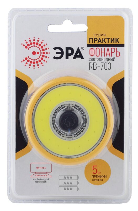 Резиновый чехол не только надежно удерживает фонарь на поверхности, но и защищает его от падений. Дополнительная гарантия долговечности - корпус из ударопрочного пластика. ЭРА RB-703 работает от трех батареек АА.