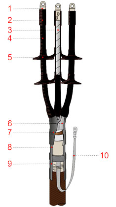 Муфта 3КНТпН-10-150...240 (с наконечниками) термоусаживаемая концевая наружной установки для кабеля с бумажной изоляцией на напряжение до 10 кВ включительно, с трекингостойкими жильными трубками не распространяющими горение, с пониженным газо- и дымовыделениеми.