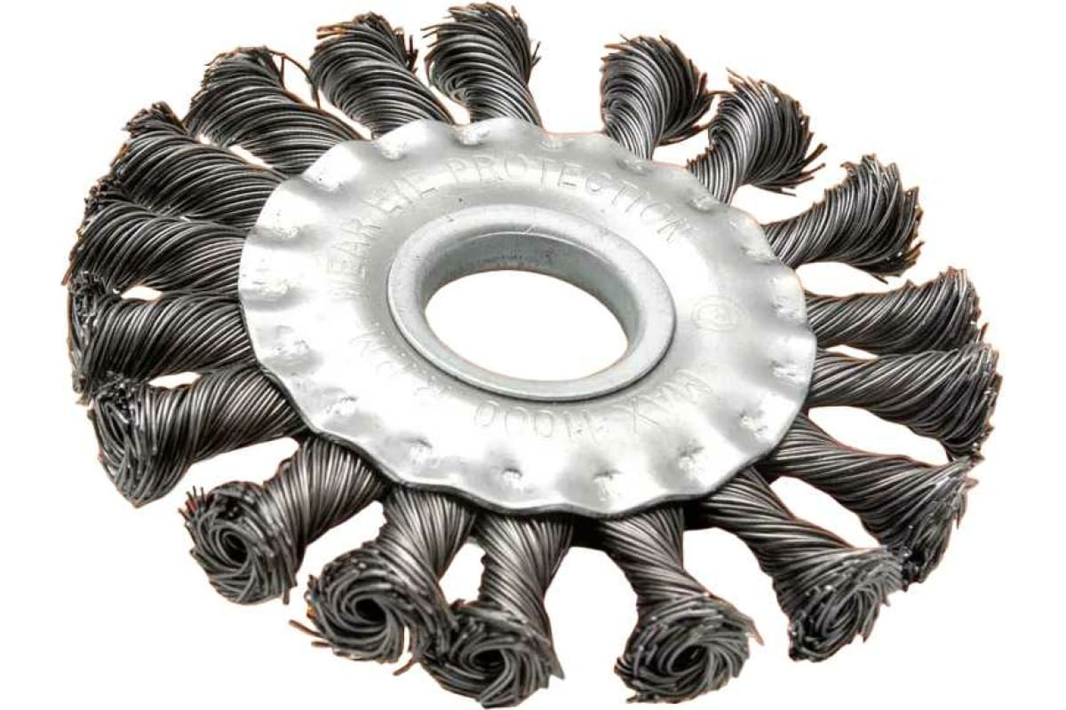 Щётка для УШМ плоская, крученая, 125 мм Вихрь – это сменная насадка для шлифовальной обработки поверхности. Изготовлена из упругих плетёных пучков из стальной проволоки. Предназначена для зачистки от лака, краски и коррозии, работы со сварочной окалиной, обработки материалов высокой плотности.