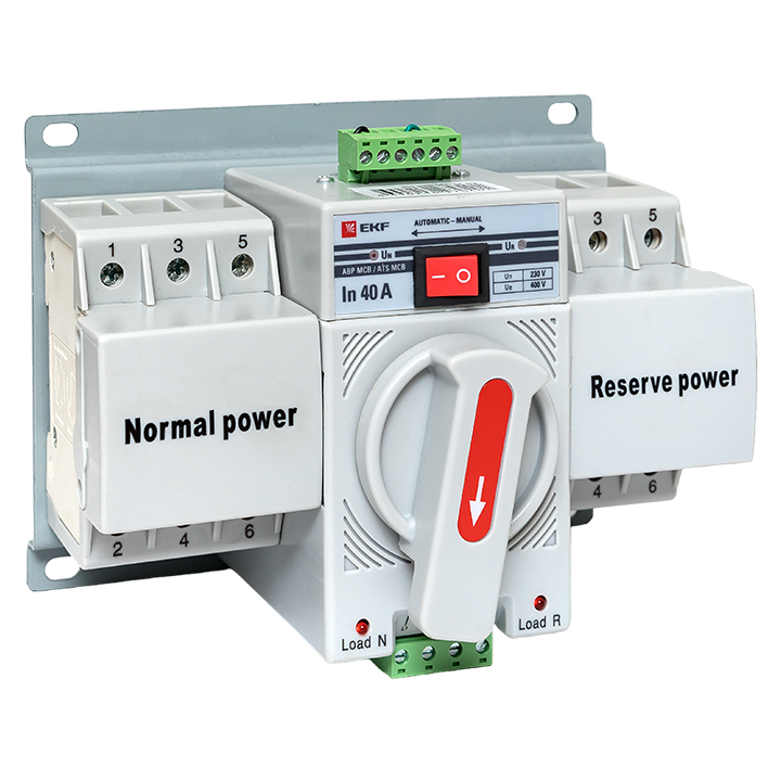 Устройство АВР EKF предназначено для обеспечения резервным электроснабжением нагрузки, подключенной к системе электрообеспечения, имеющей основной и резервный вводы. Устройство АВР автоматически подключает резервную линию питания в случае исчезновения напряжения на основной линии. Предназначен для трехфазных четырехпроводных (или однофазных однопроводных) систем двойного энергопитания переменного тока с частотой 50/60 Гц, номинальным напряжением 400 В/230 В и номинальным током до 63А. Устройство выполнено в виде моноблока и состоит из блока управления и двух модульных автоматических выключателей. На блоке управления имеется рычаг ручного переключения. Такая конструкция позволяет уменьшить габариты и площадь установки АВР.