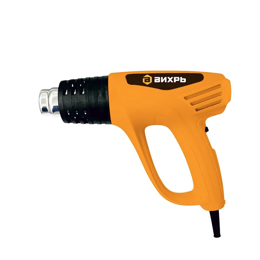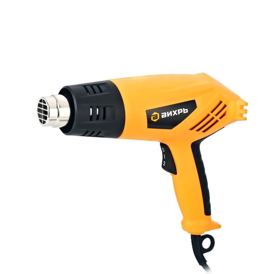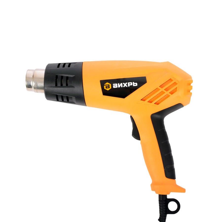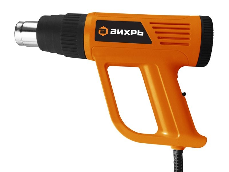 В модели ВИХРЬ ТП-2000 реализованы 2 режима работы с различной величиной воздушного потока, для установки которых предусмотрен специальный переключатель. Первый режим – поток 300 л/мин, температура 400°С, второй – 500 л/мин, 550°С. Промышленный фен оснащён также термореле, которое обеспечивает надёжную защиту от перегревов. Эргономичная рукоять и сама форма инструмента позволяют работать им просто и эффективно. В комплект входят непосредственно термопистолет, пластиковый кейс, четыре насадки и треугольный скребок. Напряжение сети питания – 220 В. Вес инструмента – 750 г.
