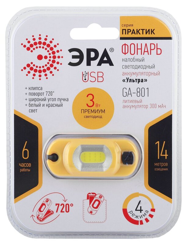 Фонарь GA-801 серии "Практик" идеально подходит для бытовых и практических задач. Его его удобно использовать для работы в доме, в саду или в любой ситуации, когда необходим дополнительный источник света и свободные руки. Фонарь питается от аккумулятора на 300 мАч. Его хватает на 6 часов непрерывной работы в мощном режиме, а заряжается аккумулятор от USB. То есть, его очень удобно брать с собой, не нужно постоянно думать о батарейках, а зарядить аккумулятор можно от любого устройства с USB. Фонарь может работать в 4 режимах, а также светить белым и красным светом. В фонаре используется мощный светодиод на 3Вт премиум класса. Он ярче и мощнее обычных диодов, светит ровным светом, а цветовая температура такого диода приближена к естественному освещению. Дальность света составляет 14 метров.