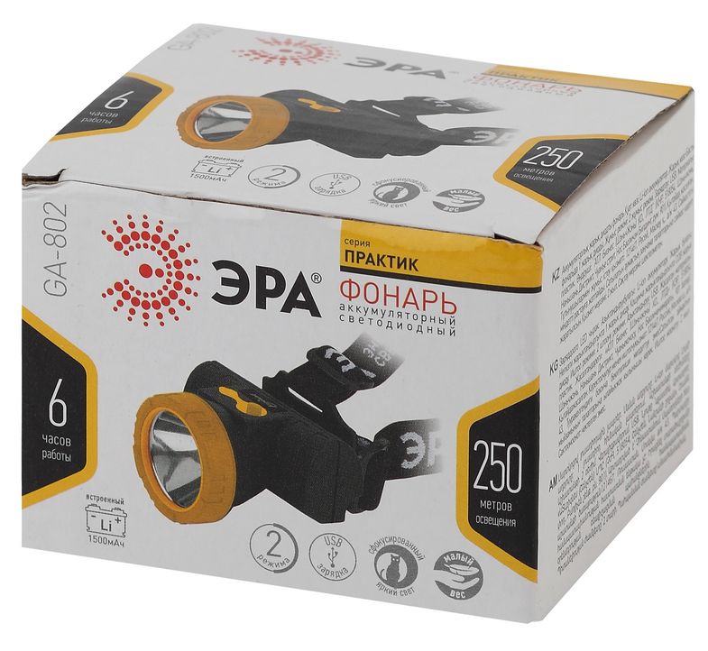 GA-802 - аккумуляторный светодиодный фонарь, отличающийся компактностью и сверхлёгкостью. Работает от лёгкого литиевого аккумулятора и удобно заряжается при помощи USB-провода, поставляемого в комплекте. Мягкий эластичный ремешок прочно фиксирует устройство на голове и даёт возможность регулировки размера. Два режима работы и повешенная дальность светового луча.Внутренняя часть корпуса покрыта мягким материалом - фонарь отлично закреплён, не скользит и не натирает кожу головы. В комплекте эластичный брендированный ремешок с возможностью регулировки размера, что делает изделие абсолютно универсальным. Также вместе с фонарём поставляется компактный провод для удобной подзарядки от USB. От одного полного заряда фонарь работает свыше 6 активных часов. За это отвечает ёмкий литиевый аккумулятор 1500 мАч. В фонаре установлен яркий современный светодиод, снабжённый широким светоотражателем. Можно выбирать нужный в зависимости от ситуации использования режим - максимальная яркость либо эконом-освещение.