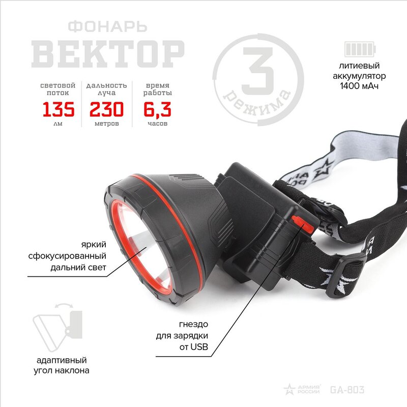 ЭРА Армия России "Вектор" GA-803 - налобный аккумуляторный LED-фонарь с 3 режимами работы, широким светоотражателем и поворотным корпусом для выбора нужного направления света. Мягкий эластичный ремешок прочно фиксирует устройство на голове и даёт возможность регулировки размера. Вектор отличается повышенной для такого компактного фонаря дальностью светового луча - 230 метров. Удобная подзарядка от USB, простота в управлении и лаконичный стильный дизайн. В основе фонаря - современная LED-технология. ЭРА GA-803 светит ярко, но при этом не ослепляет и не даёт мерцания. Светодиодный элемент снабжён широким светоотражателем для максимального качества освещения. Нужный угол направления света легко выбрать, не снимая устройства с головы - корпус имеет поворотную конструкцию. Кнопка включения расположена в верхней части фонаря. Она позволяет выбрать удобный режим работы - максимальная яркость, стандартный свет и эконом-режим. Для каждой ситуации - свой свет. Фонарь серии Вектор идеален для туризма, рыбалки и охоты.