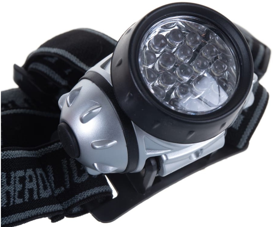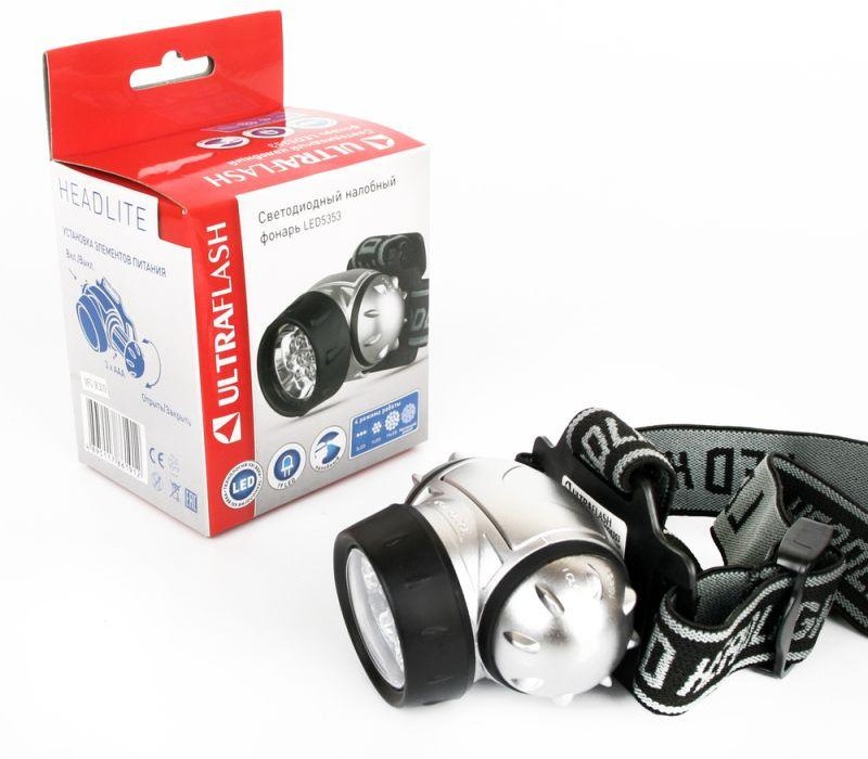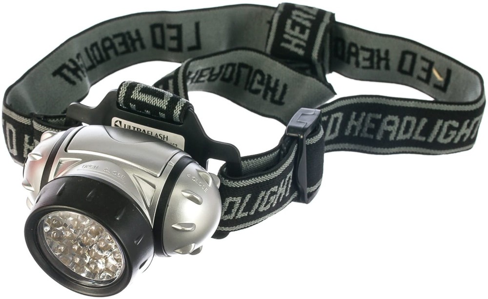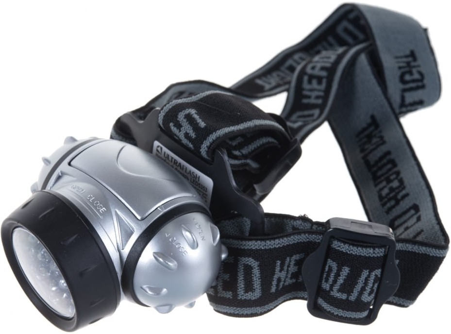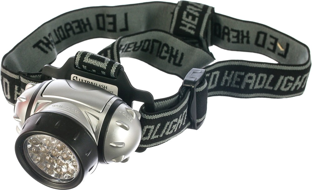 Фонарь Ultraflash электрический светодиодный налобный. Цвет корпуса: серебро + чёрный. Работает от 3 X AAA батареек (не входят в комплект). Материал корпуса - пластик. Источник света - 19 светодиодов с рассеивающими линзами с цветовой температурой 8000К со световым потоком 42 люмен. Дистанция освещения - до 25 метров. Четыре режима работы. Выключатель - четырёхпозиционный кнопочного типа. Время работы при использовании солевых батареек: 3 светодиода - до 35 часов, 7 светодиодов - до 25 часов, 19 светодиодов - до 14 часов, 19 светодиодов в мигающем режиме - до 70 часов. Комплектация: фонарь, эластичный ремешок для ношения на голове, поворотный отражатель, инструкция, упаковка. Степень пыле-влаго-защиты IP44.