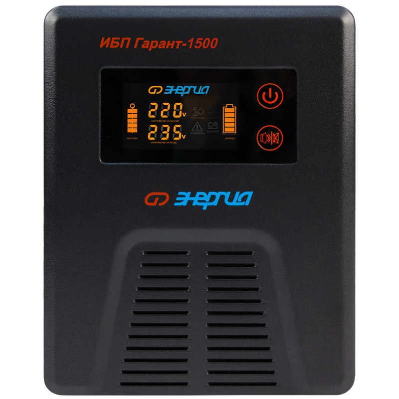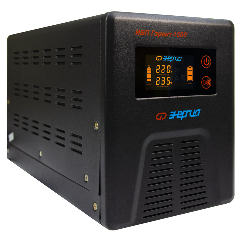 Инверторы «Энергия» серии ИБП Гарант заряжают аккумулятор в момент присутствия сети. При полном пропадании питания прибор находится в режиме преобразователя постоянного сигнала в переменный (инверторный режим). Он преобразует постоянное напряжение аккумуляторной батареи в переменное напряжение 220 Вольт, которое подается к потребителям.