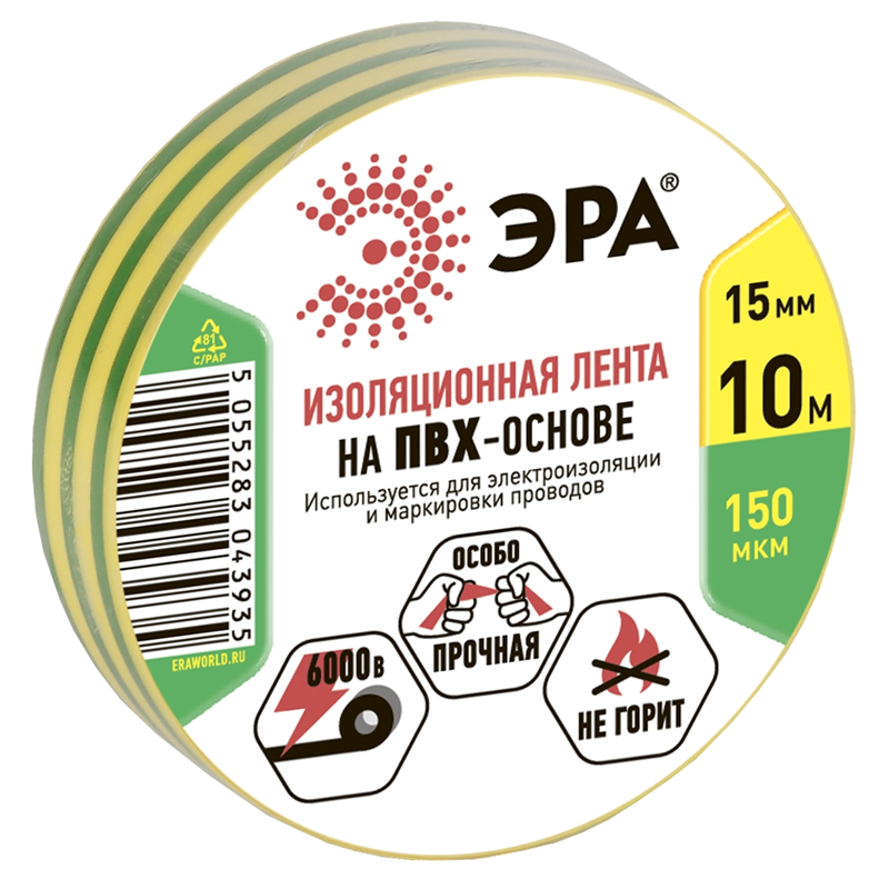 ПВХ-изолента ЭРА 15ммх10м желто-зеленая C0036559 предназначена для электроизоляции и маркировки проводов. Незаменима для проведения электротехнических и авторемонтных работ, а также соединения и изоляции труб.