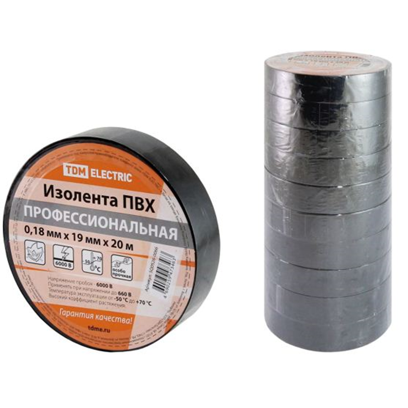 / Каталог / Электроизоляционные материалы / Ленты электроизоляционные / Изолента / Изолента ПВХ профессиональная 0,18х19мм Черная 20м TDM
