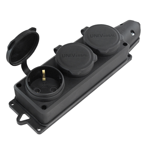 / Каталог / Электроустановочные изделия / Вилки, колодки, разветвители / Колодки / Колодка 3-м "КОМПАКТ" однофазная с заглушками (каучук) UNIVersal