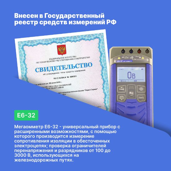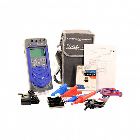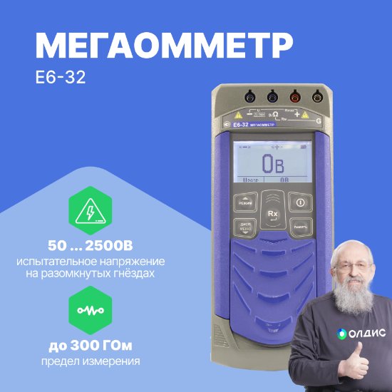 Е6-32 - это цифровой мегаомметр, используемый для измерения сопротивления в электрических цепях и напряжения до 700В. Он имеет современный эргономичный дизайн и новейшую элементную базу. Принцип его работы заключается в измерении тока через тестируемый объект при приложении к нему постоянного напряжения. Результаты отображаются на дисплее, а диапазоны измерений переключаются автоматически. Эта модель также имеет расширенные функции для измерения малых сопротивлений постоянному току, классификационного напряжения ограничителей перенапряжения и напряжения пробоя разрядников. Она также имеет память на 10 000 измерений, которые можно вывести на дисплей или внешнее устройство через Bluetooth. Измерение малых сопротивлений основано на измерении напряжения при прохождении через тестируемый объект постоянного тока. Результаты также отображаются на дисплее.