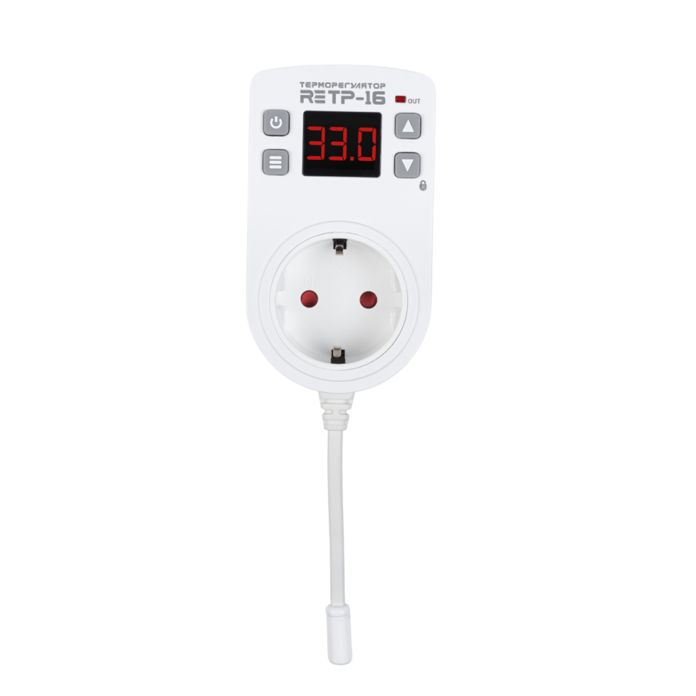 Одноканальный,  с выносным датчиком, предназначен для  управления нагревом или охлаждением в диапазоне температур от -50  до +125 ºС,  Монтаж непосредственно в розетку.