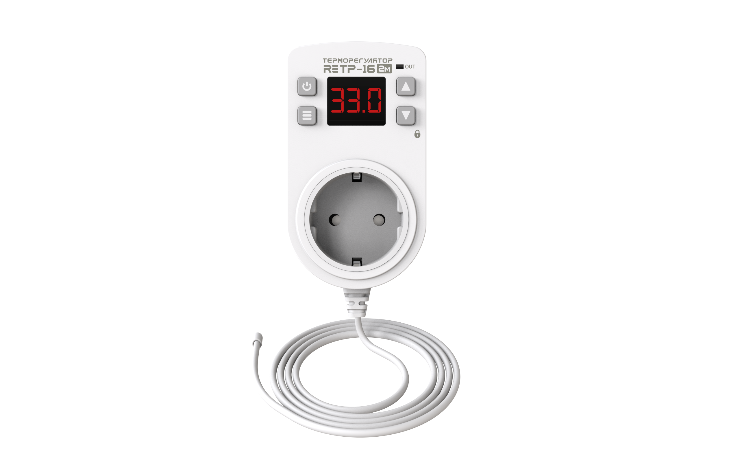 Одноканальный,  с выносным датчиком, предназначен для  управления нагревом или охлаждением в диапазоне температур от -50  до +125 ºС,  Монтаж непосредственно в розетку.
