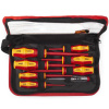 Набор изолированного инструмента КВТ НИИ-09 63995 предназначен для проведения электромонтажных работ. Все изделия способны выдержать напряжение до 1000 В. В рукоятках пассатижей и бокорезов есть упоры для исключения соскальзывания.