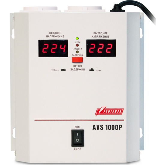 Powerman AVS 1000P - однофазный стабилизатор мощностью 1000ВА. Обеспечивает для подключенного оборудования уровень напряжения 220В (отклонения не превышают допустимые по ГОСТ 32144―2013 «Нормы качества электрической энергии»). В диапазоне напряжений сети 110В - 260В обеспечивает выходное напряжение 220В ± 8% . При слишком высоком или слишком низком напряжении сети, которое стабилизатор не может компенсировать, а также при значительной перегрузке он отключает нагрузку. Питание нагрузки подключается автоматически при восстановлении напряжения сети до рабочего диапазона, либо при снижении температуры. Подключение, после защитного отключения нагрузки или полного отключения сети, происходит с временной задержкой 6сек / 180сек. Запас мощности и оптмизация конструкции трансформатора позволили не только понизить границу рабочего диапазона, но и повысить уровень мощности, передаваемой в нагрузку при пониженном напряжении сети.