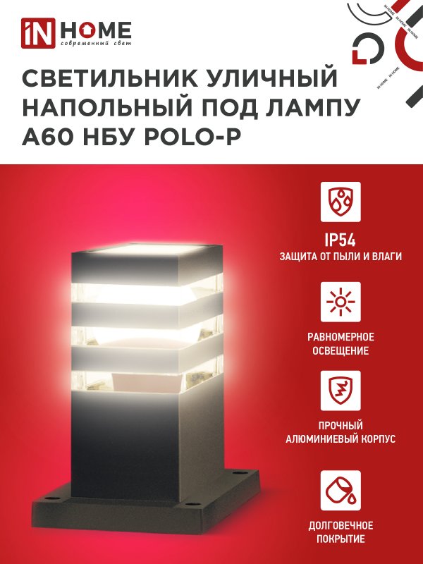 / Каталог / Светотехника / Светильники для уличного освещения / Светильник уличный напольный НБУ POLO-SP300-1xA60-BL алюминиевый 300мм черный IP54 IN HOME