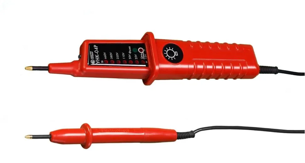 Двухполюсный указатель напряжения УНК-0,4 (Р) предназначен для определения отсутствия или наличия, а также значения напряжения до 600В. Обладает яркой светодиодной и звуковой индикацией, из дополнительных функций имеются фонарик, определение полярности, направления выражения, прозвонка цепи, определение фазного проводника. Указатель соответствует требования ГОСТ 20493-2001
