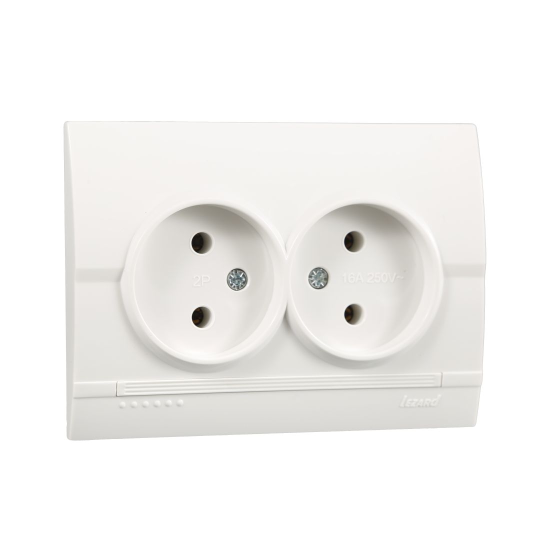 / Каталог / Электроустановочные изделия / Розетки и выключатели / Розетка двойная б/з керамика белый DERIY
