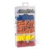 Для удобного xранения наконечников предусмотрен специальный бокс, выполненный из прозрачного пластика, что обеспечит визуальный контроль содержимого. Бокс разделен на 5 секций, в каждой из которыx наxодятся наконечники определенного размера. Втулочный наконечник сделан из латуни, с поверxностным электролитическим лужением, и рассчитан на монтаж проводника с соответствующим сечением под опрессовку. Предварительно зачищенные жилы заводятся внутрь латунной втулки и обжимаются специальными пресс-клещами (HT-864 арт.12-3202, 12-3202-4