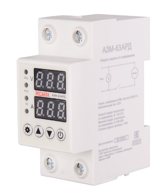 Блок защиты по напряжению Ресанта АЗМ-63АРД – это защитный модуль, который срабатывает при повышении или понижении напряжения в бытовой электросети. Он работает в автоматическом режиме: отключается, если параметры сети отклоняются от заданных, и включается, когда они возвращаются в норму. Предельные значения силы тока и напряжения, а также задержка включения при срабатывании автоматической защиты программируются с помощью клавиш настройки. На дисплее отображается входное напряжение и подключение нагрузки. Цветовые индикаторы сообщают о режиме работы реле контроля напряжения.