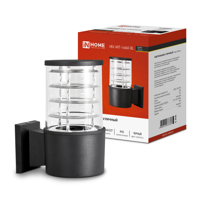 / Каталог / Светотехника / Светильники для уличного освещения / Светильники накладные, настенные / Светильник уличный настенный односторонний НБУ ART-1хA60-BL алюминиевый черный IP54 IN HOME