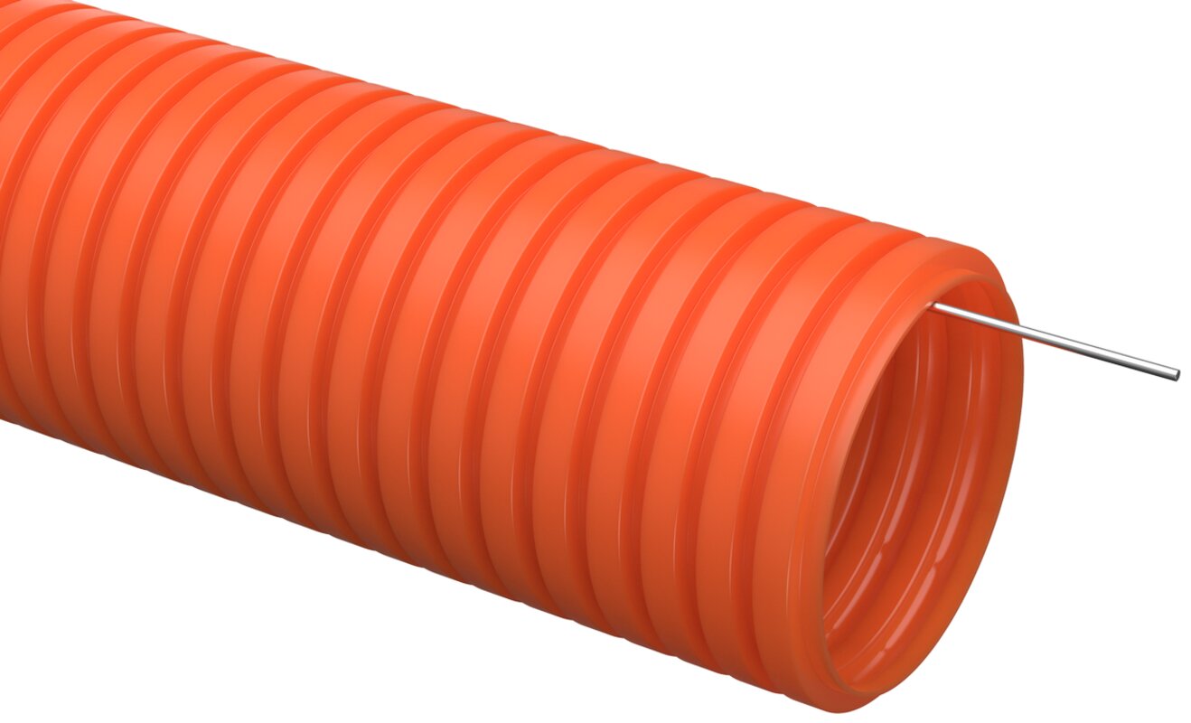 Гибкая гофрированная труба предназначена для прокладки в ней электрических, компьютерных, телевизионных кабелей. Она имеет проволочную протяжку для упрощения прокладки кабеля. Труба такого типа отличается повышенной прочностью и может использоваться в монолитном бетоностроении и для скрытой прокладки в стяжке полов (при этом основание должно быть выполнено из несгораемого материала) или же в штробах стен. Труба обеспечивает степень пыле- и влагозащиты до IP 55 (при использовании специальных аксессуаров), устойчива к старению.