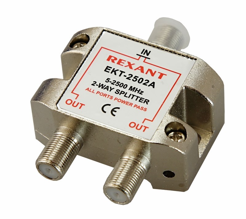 Сигнал, подающийся на вход, делится на две равные части и передается на выходы. Для подключения кабелей используются стандартные F-разъемы.