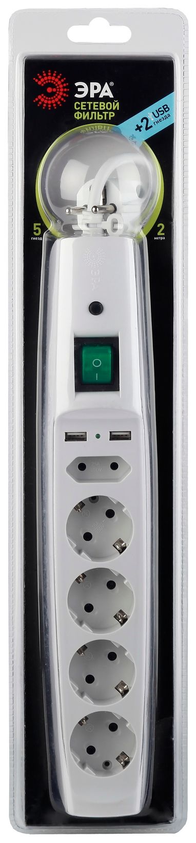 Сетевой фильтр ЭРА SFU-5es-2m-W с надежной защитой с заземлением с выключателем 5 розеток 2xUSB 2м