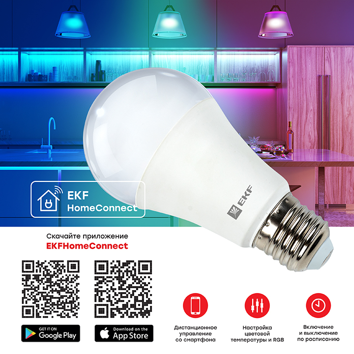 Умная лампа EKF Connect E27 позволят изменять цветовую температуру, цвет и яркость, чтобы создать ту атмосферу, которая нужна в данный момент. Умными лампами можно дистанционно управлять по Wi-Fi с помощью мобильного приложения EKF Connect для iOS и Android. В приложении можно устанавливать расписание включения и выключения. Также поддерживается голосовое управление с помощью Алисы от Яндекса, Маруси от VK и Салюта от Сбера. Сценарии позволяют управлять несколькими устройствами с помощью одной голосовой команды или нажатия кнопки. Преимущества: Тёплый или холодный белый свет на выбор Регулировка яркости Цветная подсветка Работает с iOS и Android Работает с Алисой, Марусей и Салютом Поддержка протокола Bluetooth Low Energy (BLE) для быстрого подключения и для прямого управления с телефона даже при отсутствии Wi-Fi Функция светомузыки с использованием микрофона телефона Применение: Автоматизация освещения в квартире Цветная подсветка интерьера