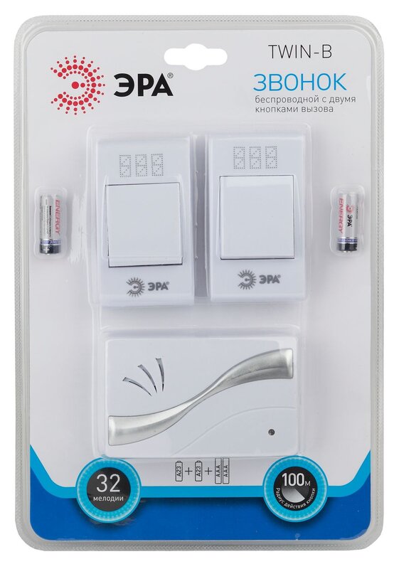 Звонок дверной ЭРА TWIN-B беспроводной две кнопки белый 32 мелодии