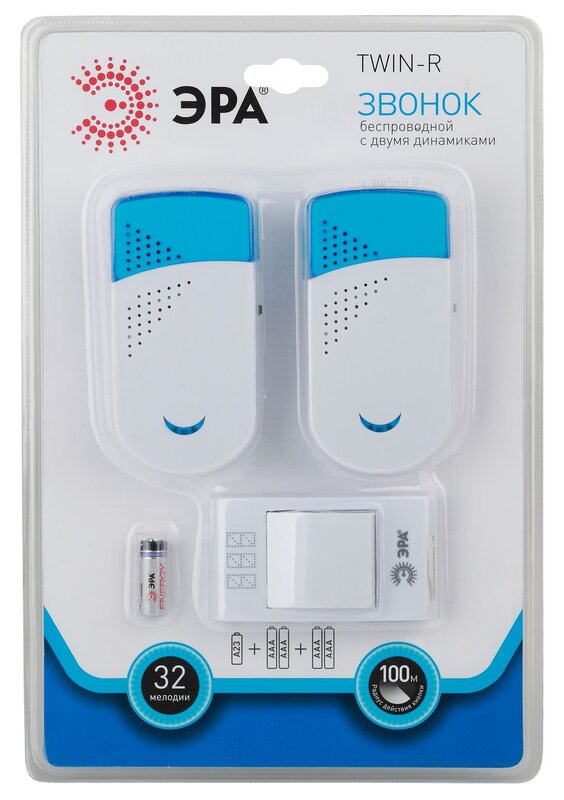 Звонок дверной ЭРА TWIN-R беспроводной два динамика белый с голубым 32 мелодии