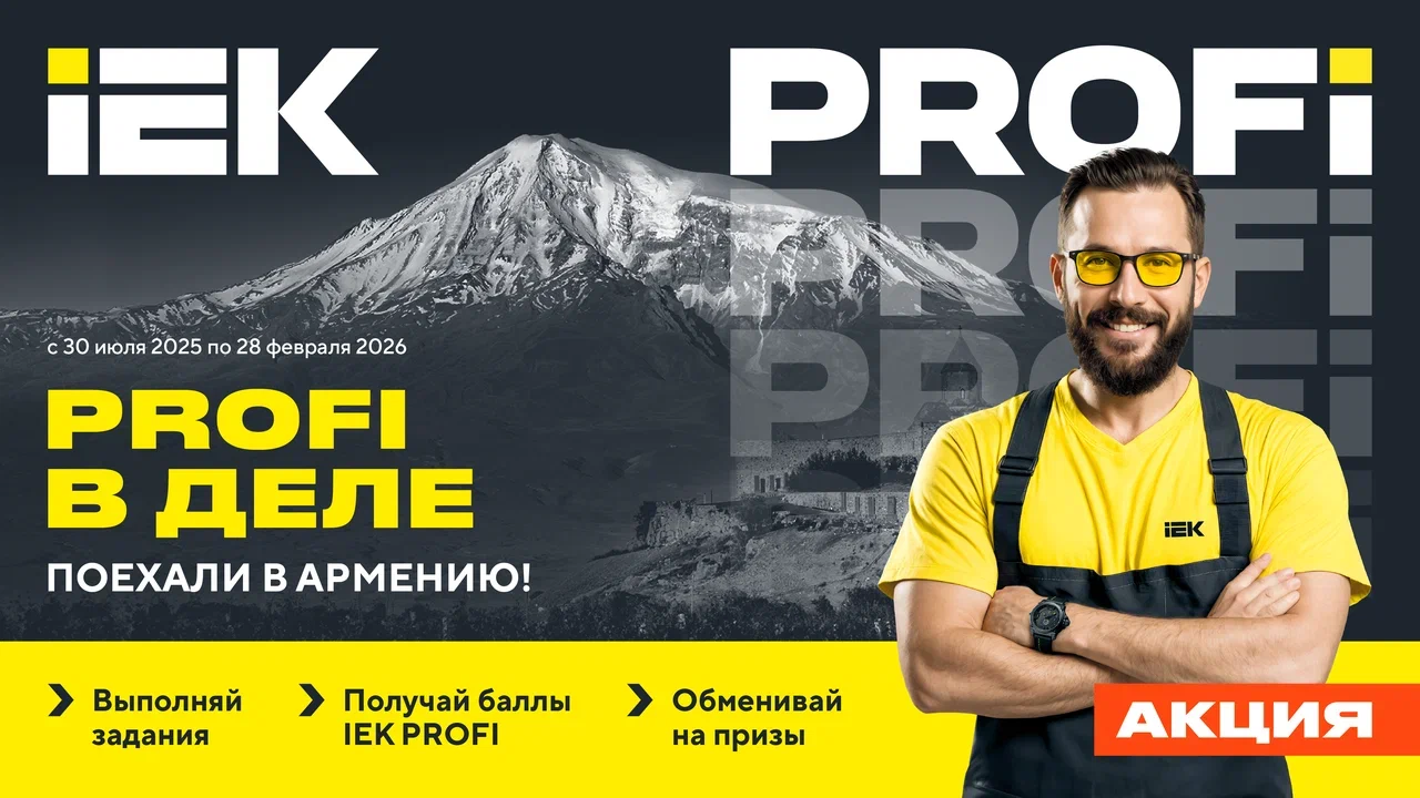 Покупай акционную продукцию IEK, регистрируй чеки — отправляйся в поездку-впечатление в Армению! Акция проходит с 24 июля 2025 по 28 февраля 2026.1 Зарегистрируйся на Бизнес-платформе как электромонтажник