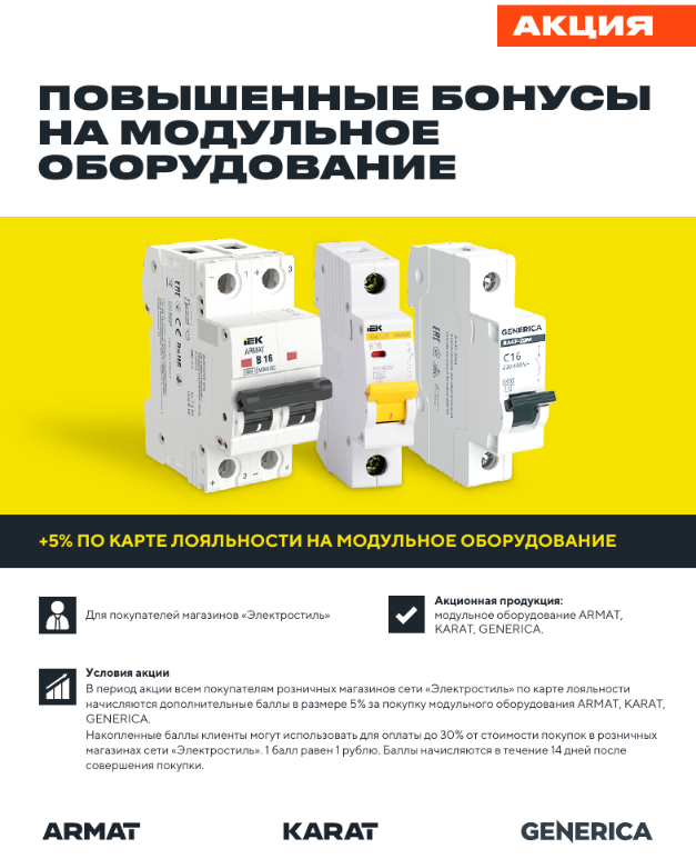 В период действия акции всем покупателям розничных магазинов сети «Электростиль» по карте лояльности начисляютсядополнительные баллы в размере 5% за покупку модульного оборудования ТМ ARMAT, KARAT, GENERICA.